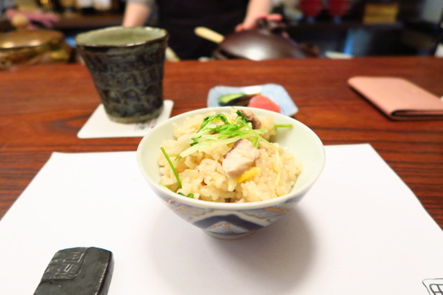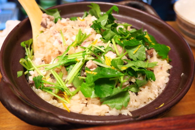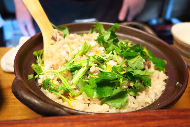 最後のご飯は、大きな土鍋で炊いた鯛飯です!