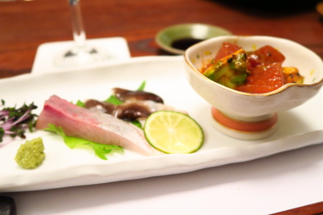 お刺身が2種類と小さな小鉢。和食に少しだけ洋がプラスされている感じ。