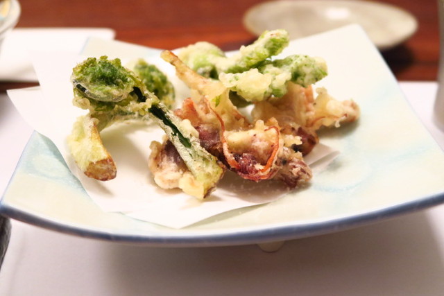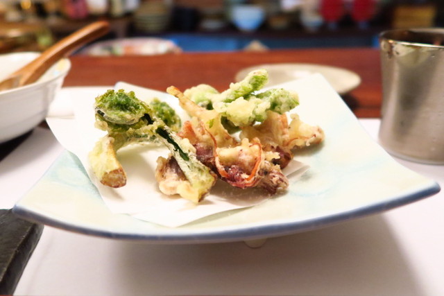 蛍烏賊と山菜の天ぷらは、薄めの衣でサクッと揚げられています。蛍烏賊は衣のサクサク感と肝の濃厚さがベストマッチ。これは日本酒が進みます…!