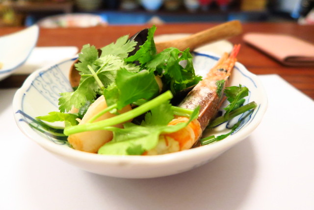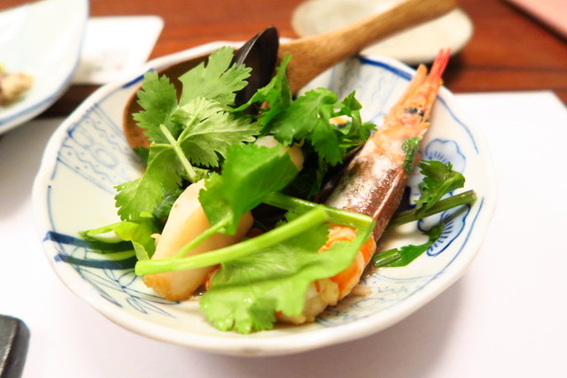 ホタテ、ムール貝、エビとパクチーをお酒で蒸したもの。