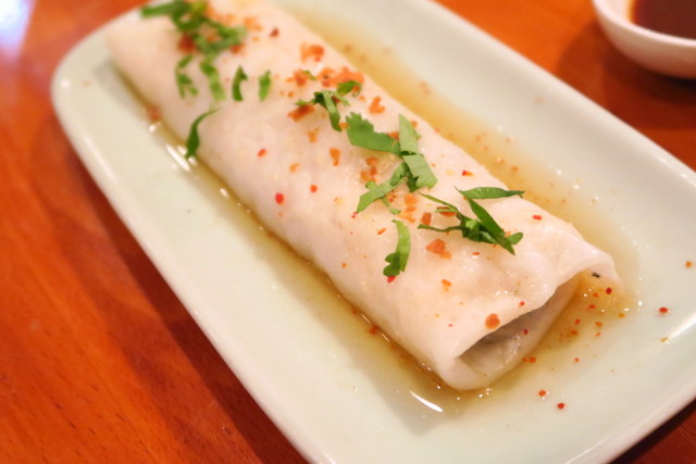 海老が2つも入って、大きなニラが巻かれた定番スタイル。ピーナッツの入った甘辛のソースをたっぷりつけていただきます。