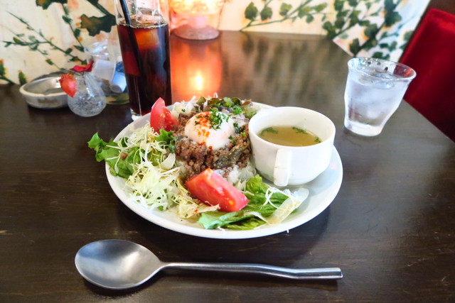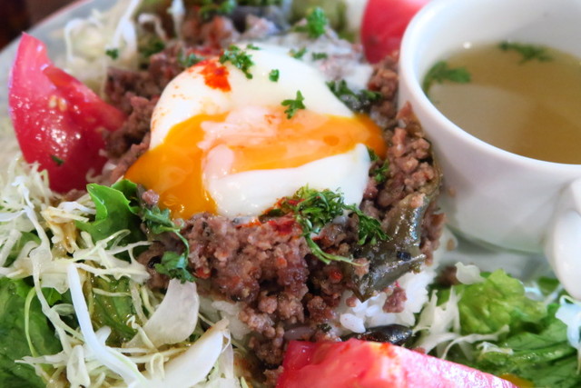 ピリッと刺激のあるお肉に卵でまろやかさをプラス。ボリュームもあっておいしいランチプレートでした。