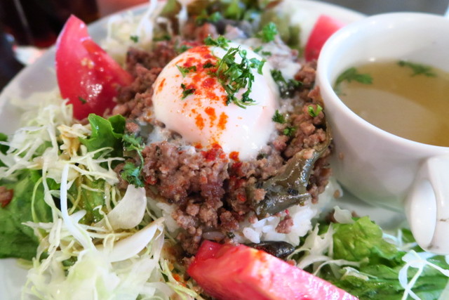 ごはんの上に、スパイシーな挽肉に温泉卵がのかっています。