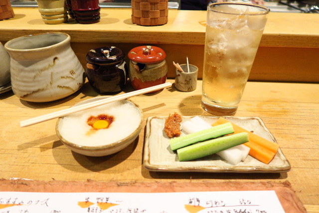 ハイボールと、お通しの野菜スティックとおろし。