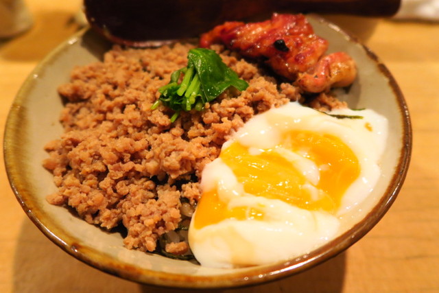 ご飯の上に、甘辛の鶏そぼろがたっぷり!さらにモモの焼き鳥2本分と自家製の温泉卵が乗った贅沢な丼。