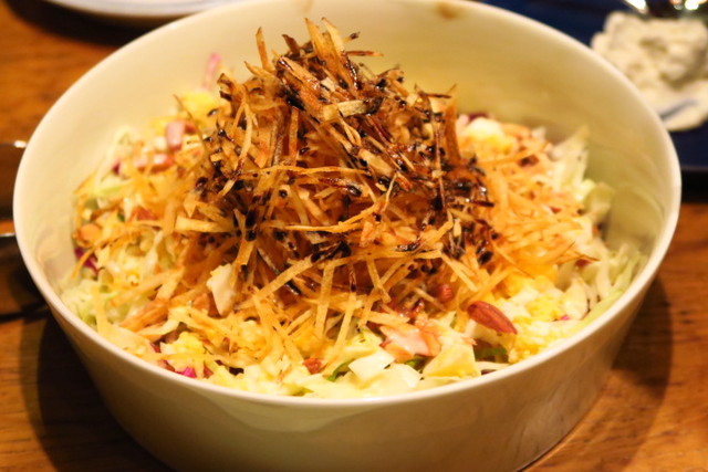 もちろん、サラダも欠かせません。トレビスとキャベツの「芋サクシャキシャキサラダ」。これがハツ的にヒットでした!お芋の食感が楽しくって、美味しい。メインにもなりそうなボリュームのあるサラダです。