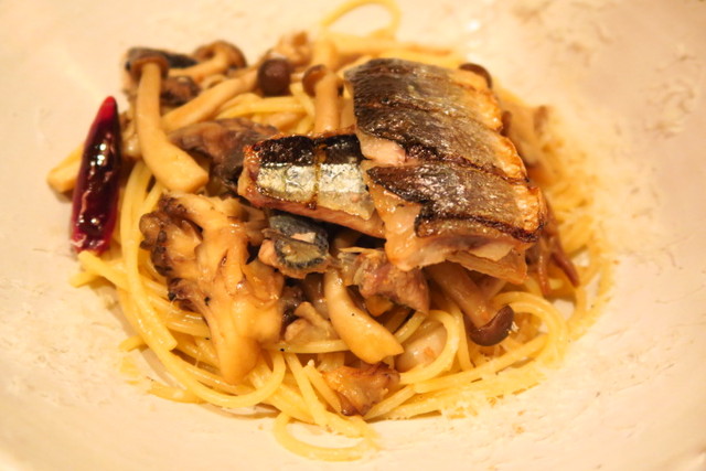 まずは、旬の食材をたっぷり使った「炭焼きサンマとキノコ」の香ばしペペロンチーノ。