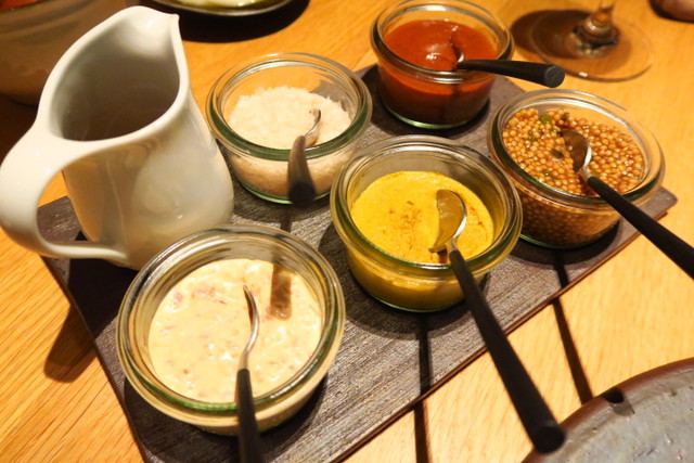 そして、この豊富なソースの種類が、ステーキの味を楽しませてくれます。マスタードやBBQソース、塩など味の変化も楽しい!