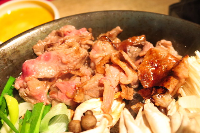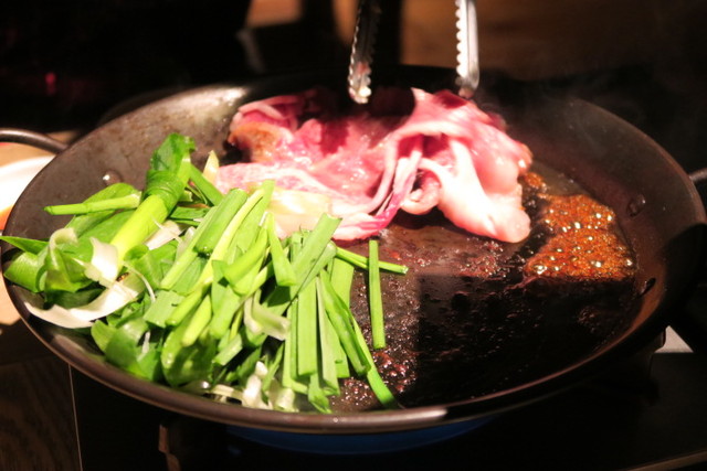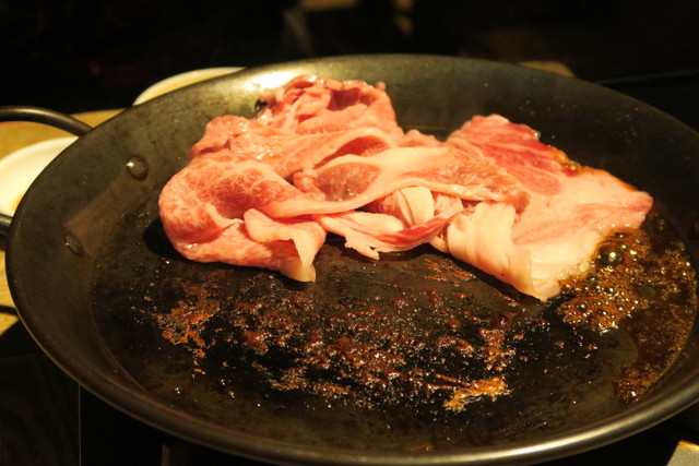 それを、すき焼き鍋のような浅いお鍋でさっと焼いていきます。