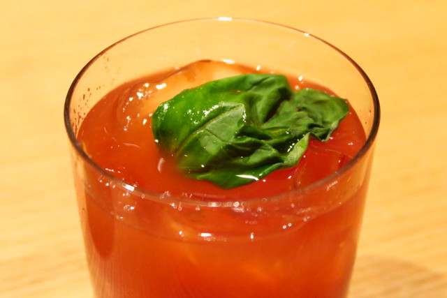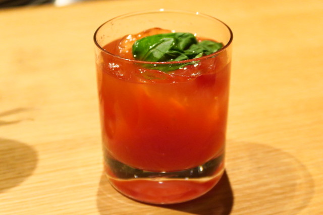 クラフトウォッカの中にトマトバジルとオリーブオイルを入れたカクテル。刻んだトマトはそのまま入っているから、とてもさっぱりとしていて食感も楽しめます。さらに、とってもさっぱりしているからお肉に劇的に合います。