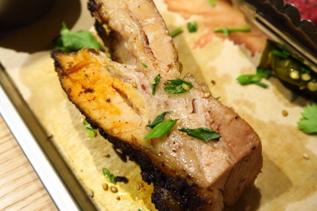 フォークでは持てないので、トングで持ち上げます。すごい重厚感!ソースなしで、胡椒のスパイスだけでお肉の味がしっかり楽しめます。これはお酒が進む。