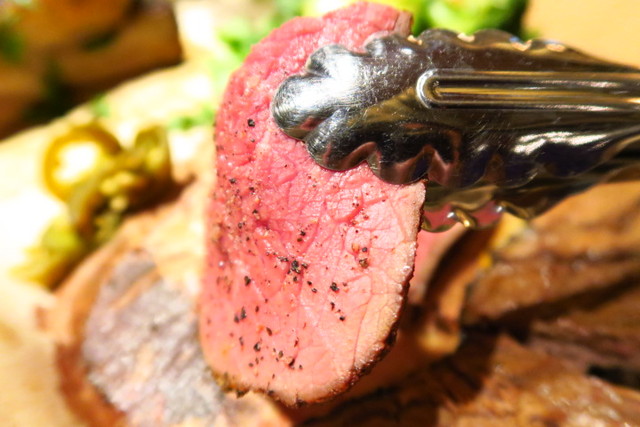 さて、肝心のお肉ですが、まずは「アンガスローストビーフ」。しっかり厚みがあるのに、ナイフを入れるとスッと切れちゃうんです。