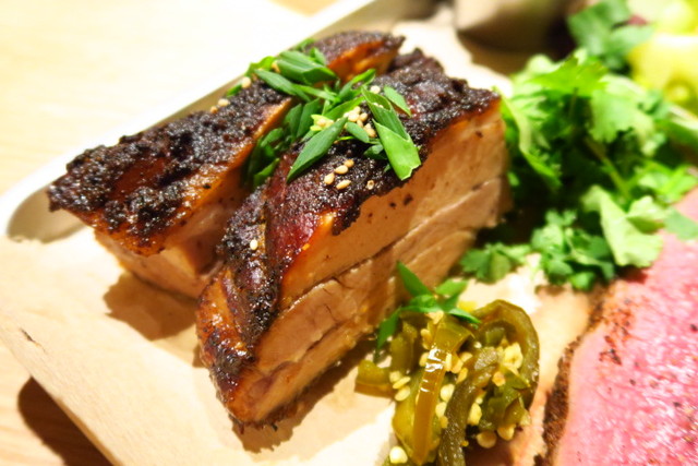 豚バラ肉をスパイスでマリネして、こちらも10時間スモークしています。これがまた、脂までとろっとろで甘いんです。もう絶品。