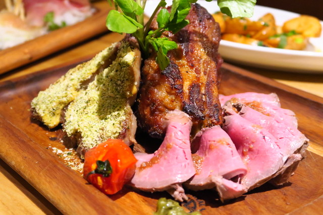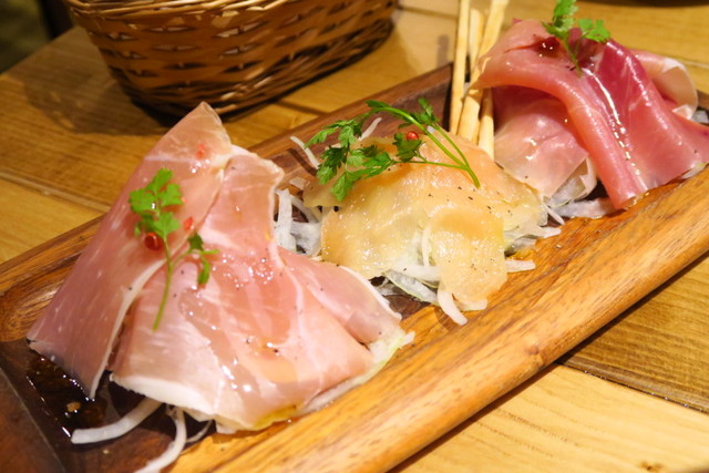 続いて、「生ハムの盛り合わせ」。ハモンセラーノ、 鶏の生ハム、プロシュートの3種盛りで頂きました。