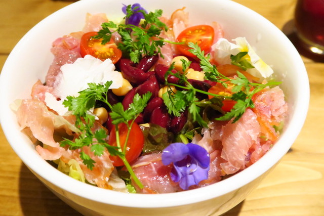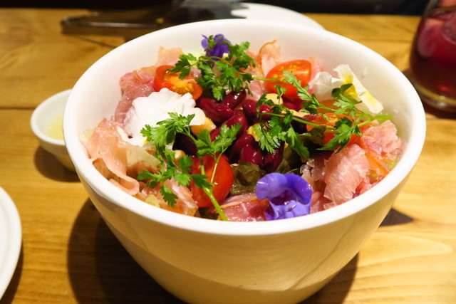ボリューム満点のサラダは、見た目も鮮やかでお花もカワイイ!もちろん、全部食べられます。