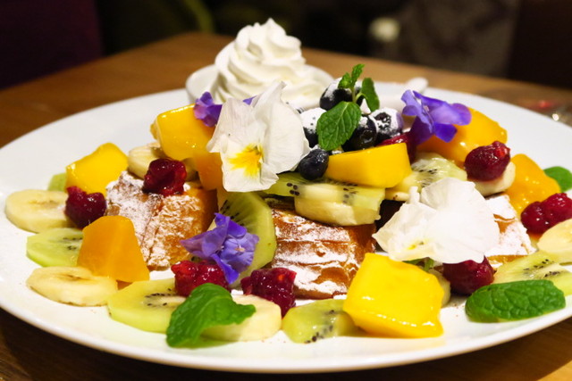 バケットを使って作るフレンチトーストの上にはフルーツが盛りだくさん。たっぷり食べてもフルーツが多めなのでヘルシーだから嬉しい。