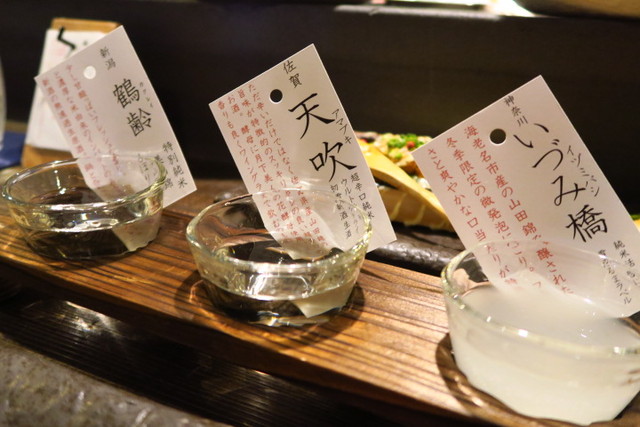 さて、美味しいお料理に日本酒もオーダー。種類がありすぎて選べない時は、飲み比べが充実しているから、ちょっとずつ、たくさん飲んでみましょう。