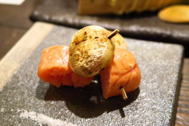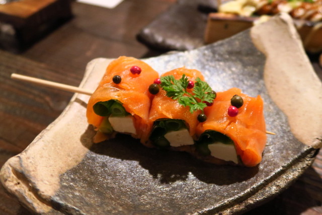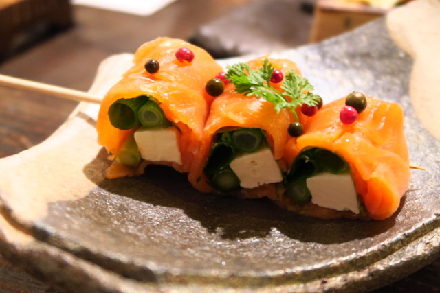存在感のあるクリームチーズとあさつきをサーモンでぐるり。チーズがサーモンに負けじとしっかり味があり、まるでイタリアンな串です。