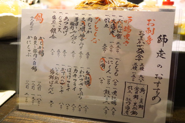お料理は定番メニューと季節のおススメという構成。お刺身から、お酒に合う逸品料理、そして名物の炉端焼き、さらにお鍋まで揃っているという充実っぷり。何を食べようか迷っちゃう。