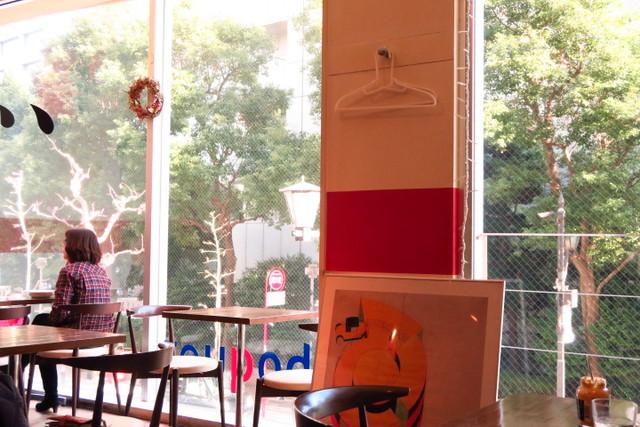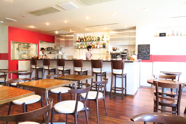 大きな窓があるから、光も差し込んで明るいです。内装は赤を差し色にしたビストロ風。