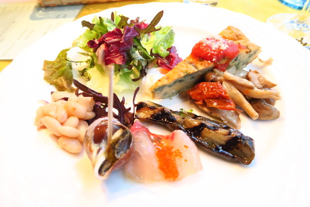 最初に登場するこの前菜の盛り合わせがボリューム満点で見た目も鮮やか〜。