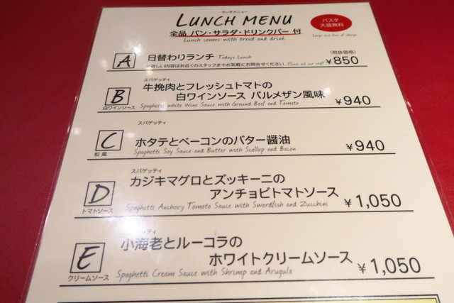 5種類のパスタからチョイスできます。どれも美味しそうで惹かれる…。