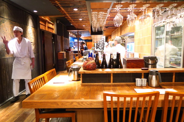 店内は和食店らしからぬ、スタイリッシュな雰囲気。ワイングラスもぶら下がっています。
