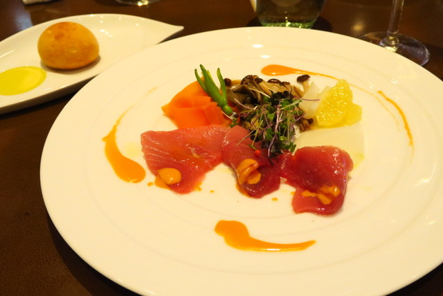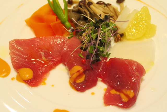 鮪の赤と野菜のグリーンやオレンジ、キノコのブラウン、そしてフルーツのイエローが美しい。