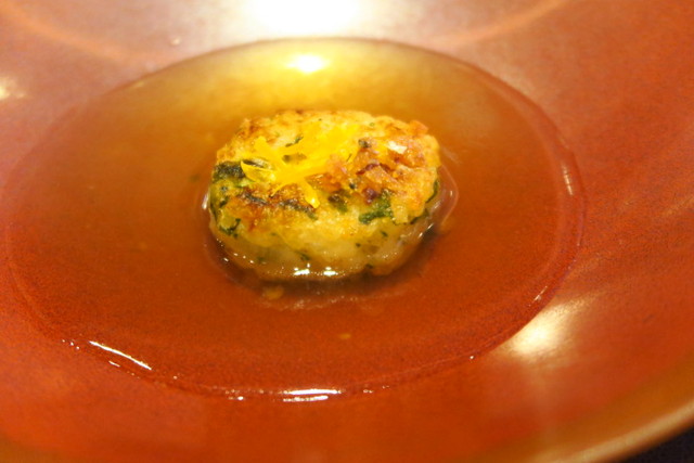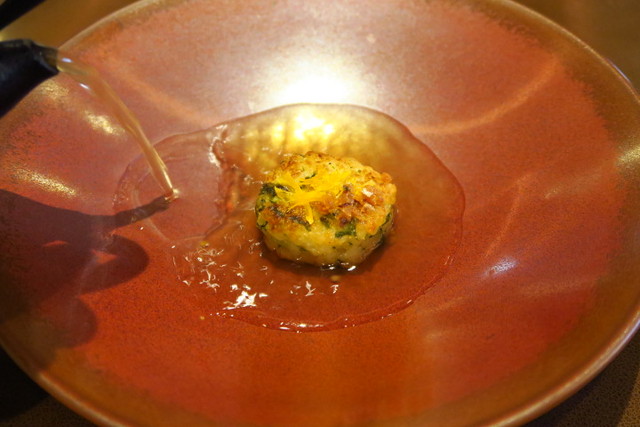 茨城米“とねの恵み”を使った焼きリゾットなのですが、なんとここに蛸のコンソメスープをかけちゃいます。