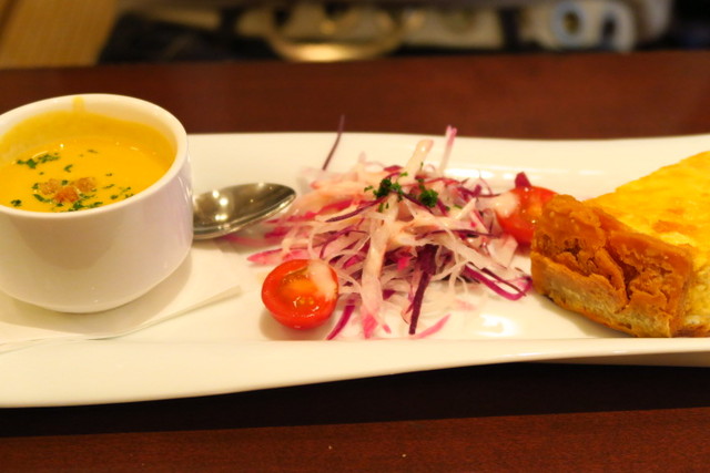 こちらの前菜は、ロレーヌ風キッシュと一口サイズの温製カボチャスープの盛り合わせ。