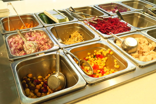 この長いカウンターでオリジナルサラダをオーダーします!