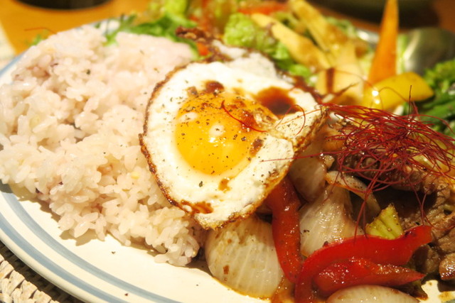 中身は、白王豚三元豚と野菜の炒め物、ピクルス、サラダ、ブロッコリーといんげんのアンチョビオリーブ和え、そしてたっぷりの雑穀ご飯の上に半熟具合がたまらない目玉焼き!