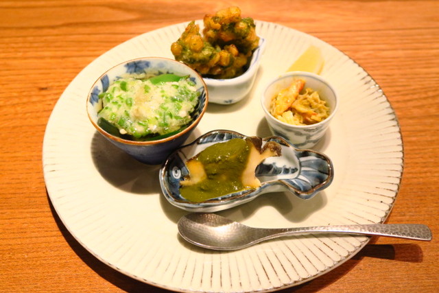アワビの肝ソースやトウモロコシの天ぷらなど、日本酒が進むものばかり。