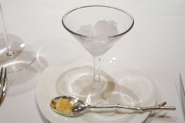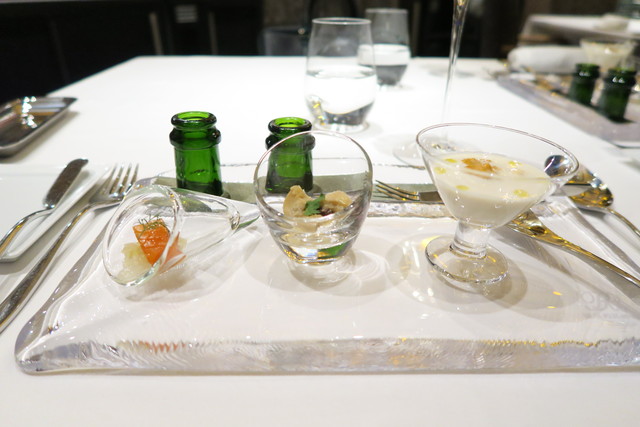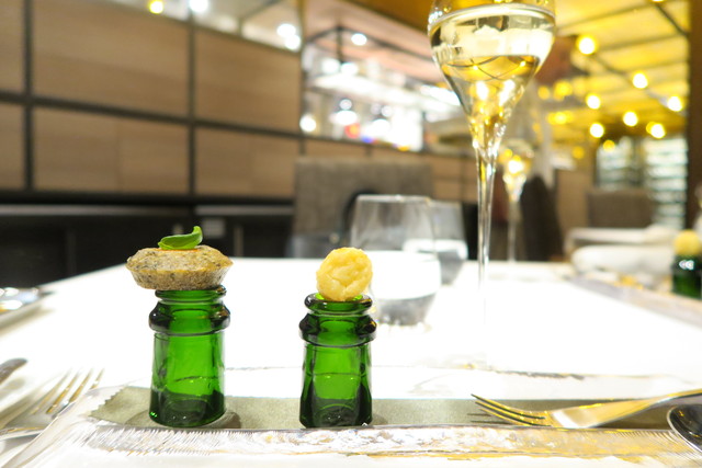 1品目のアミューズ。ワインボトルの上の部分を器に見立てています。
