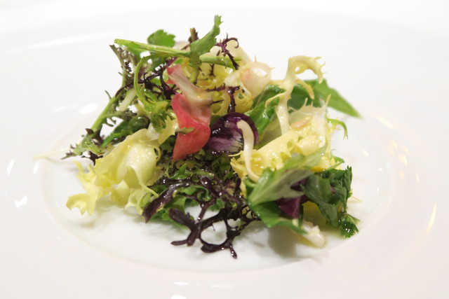「帆立貝と根セロリ、カリフラワーのドゥミドゥイユ 冬トリュフのビネグレット」。