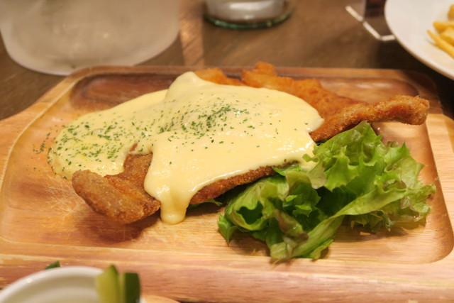 豚肉を薄く伸ばしてカリっと揚げたカツレツにとろ〜りチーズをトッピング。