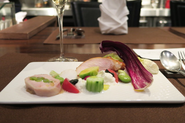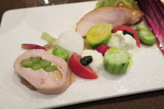美しく火入れされたガランティーヌ。春らしい野菜をたっぷりと添えていただきます。