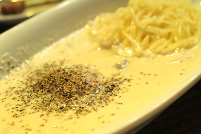 たっぷりの黒胡椒と半熟卵をよく混ぜ、パスタとよく絡めていただくスタイル。