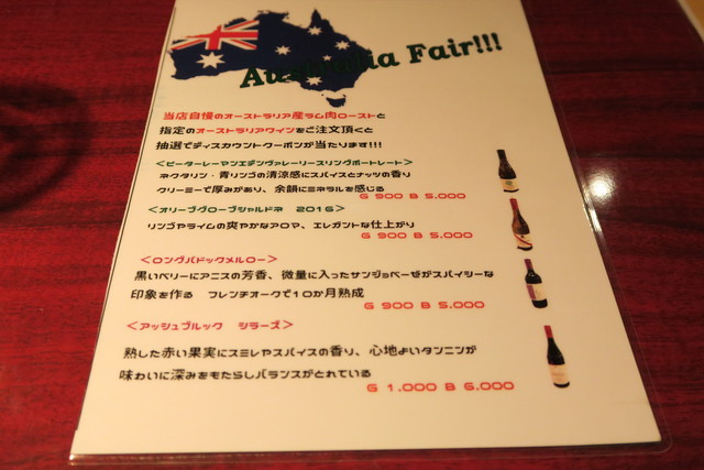 オーストラリア産ラム肉のローストとオーストラリアワインをオーダーするとクーポンが当たるキャンペーン中。