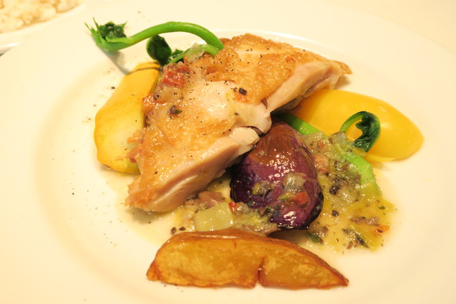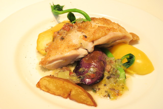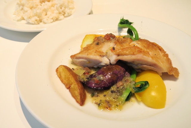 皮はパリッと身はジューシーに仕上がっていて、ワインにもよく合う。