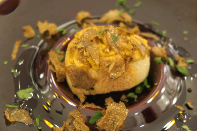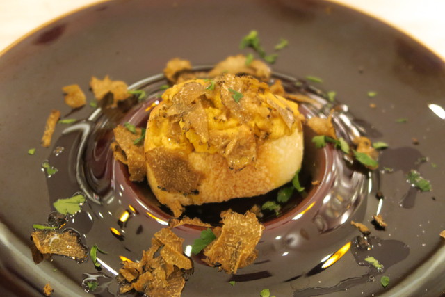 続くお料理は、ウニと黒トリュフの天然酵母のパンクロスティーニ。