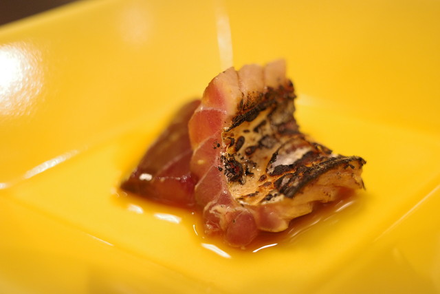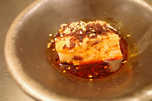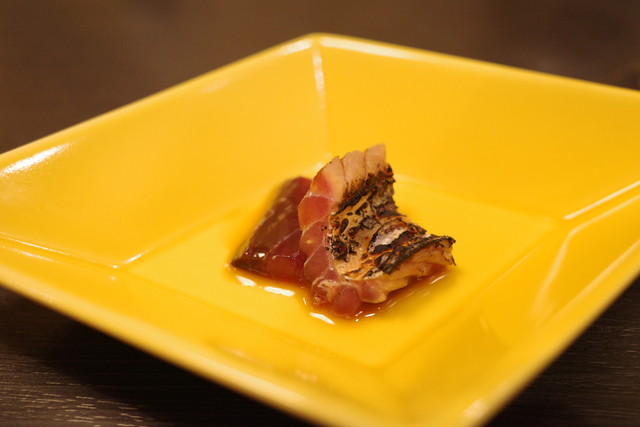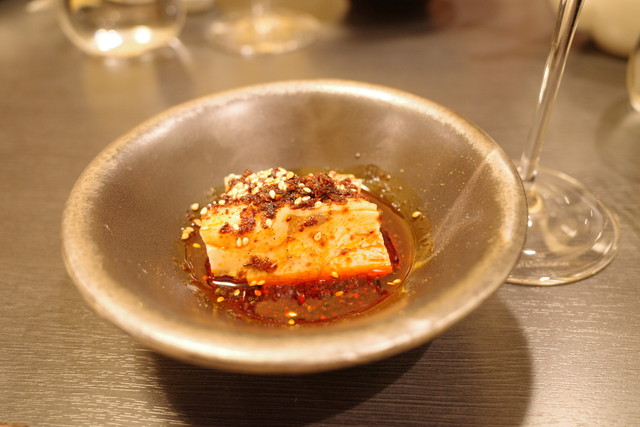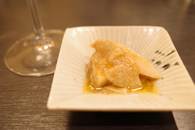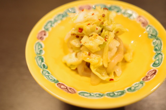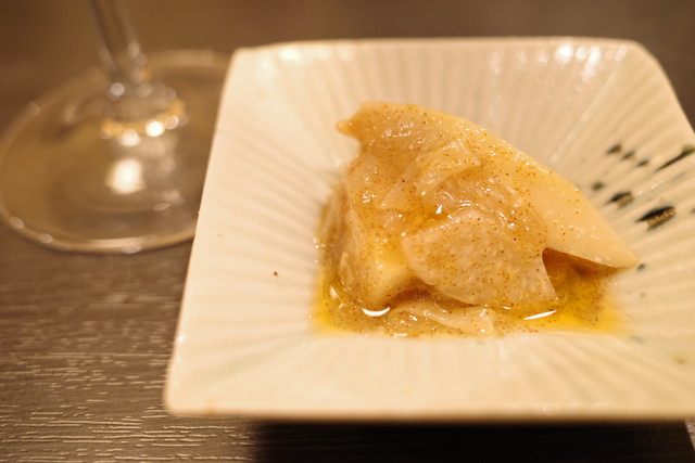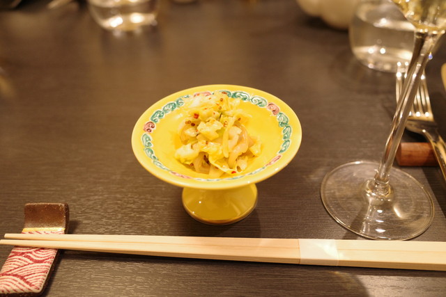 鮮やかなイエローのお皿で登場したのは、クラゲと春キャベツのマスタード和え。