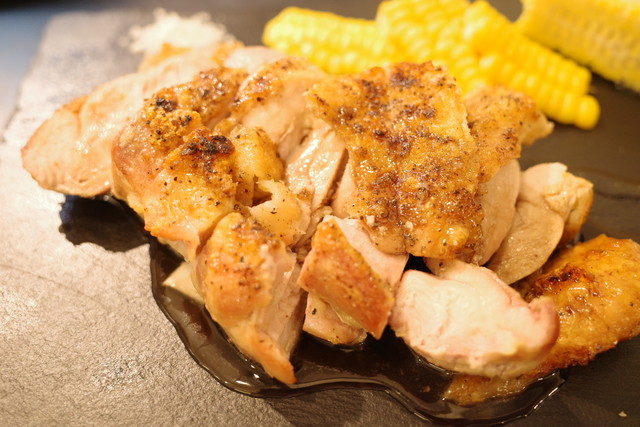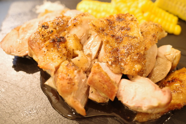 ボリューム満点の鶏のグリル、添えてあるのはトウモロコシです。