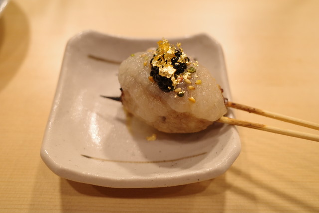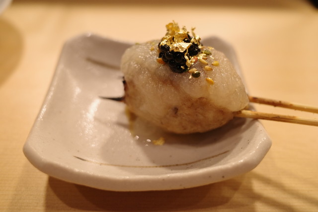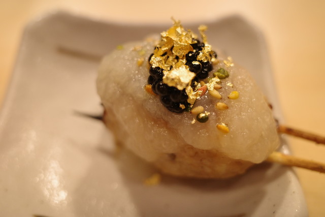続いて、熟成野菜つくね。淡路島のたまねぎのソースにキャビアと金粉を乗せて。