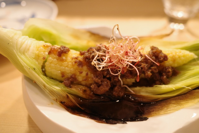 今が旬のヤングコーンは、フォンドボーと砂肝のソースで。