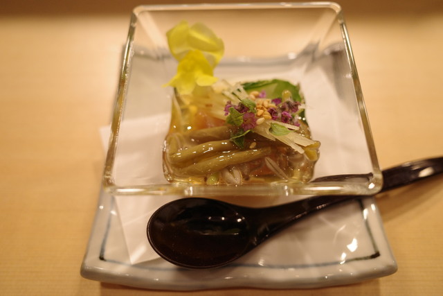 まずは、ささみの昆布締め。ジュンサイが乗って、さわやかに。