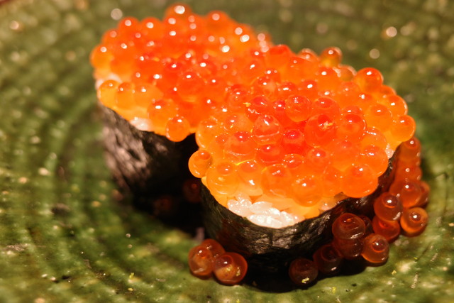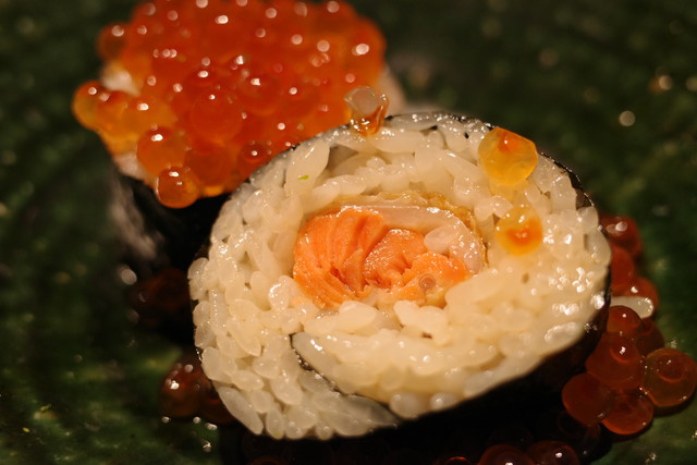 〆には、焼き鮭ハラスとイクラ太巻きを。