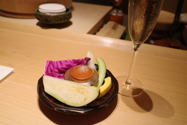 泡で乾杯しながらいただくのは、トマトの味噌をつけていただく新鮮野菜。