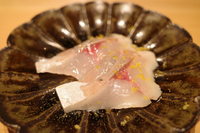 鯵の酢締めは、ごま油とレモンで風味豊かに仕上げています。