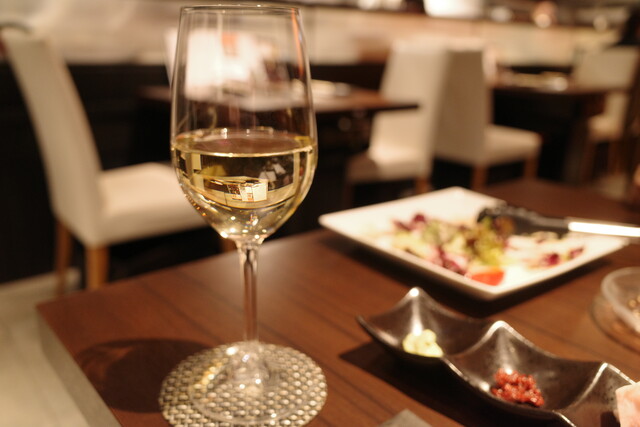 お酒は白ワインにシフト。グラスもボトルもたくさん揃っていますよ。